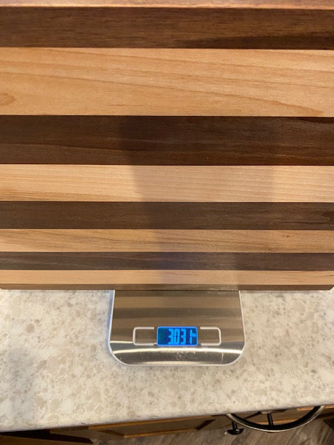 Handcrafted black walnut and maple cutting board featuring a classic striped design. Reversible with no juice groove, perfect for everyday chopping, serving, or display. Finished with food-grade mineral oil and natural beeswax.